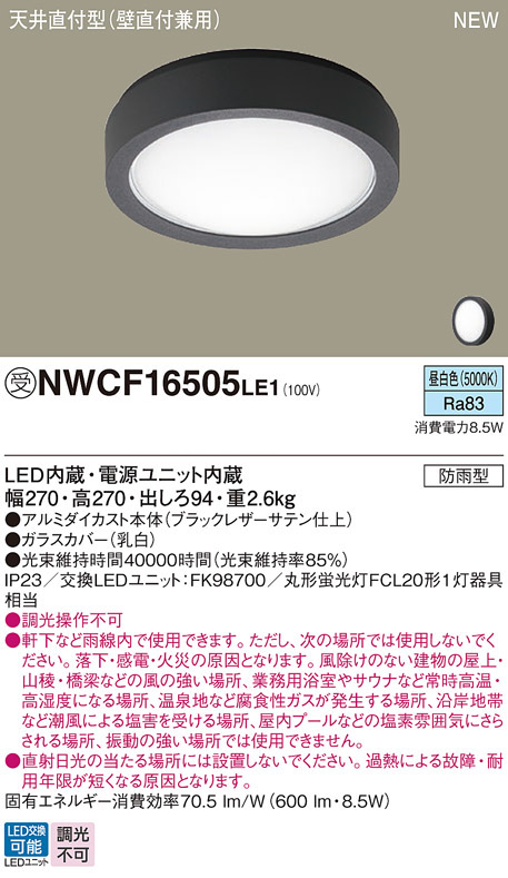 パナソニック NWCF16505LE1 防雨型シーリング階段灯 壁・天井直付型 ベーシック ブラック低光束タイプ 600lm 昼白色