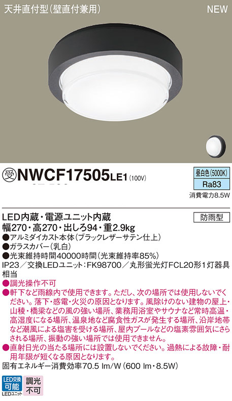 パナソニック NWCF17505LE1 防雨型シーリング階段灯 壁・天井直付型 フラット ブラック低光束タイプ 600lm 昼白色