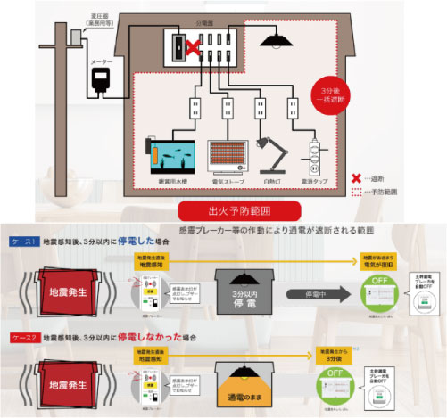 感震ブレーカーは震度5強以上の地震を感知したとき、主幹ブレーカを強制遮断して家の電気をストップ。停電後の電気の復旧による通電火災など、避難時のブレーカ切り忘れによる二次災害の発生を抑えます。