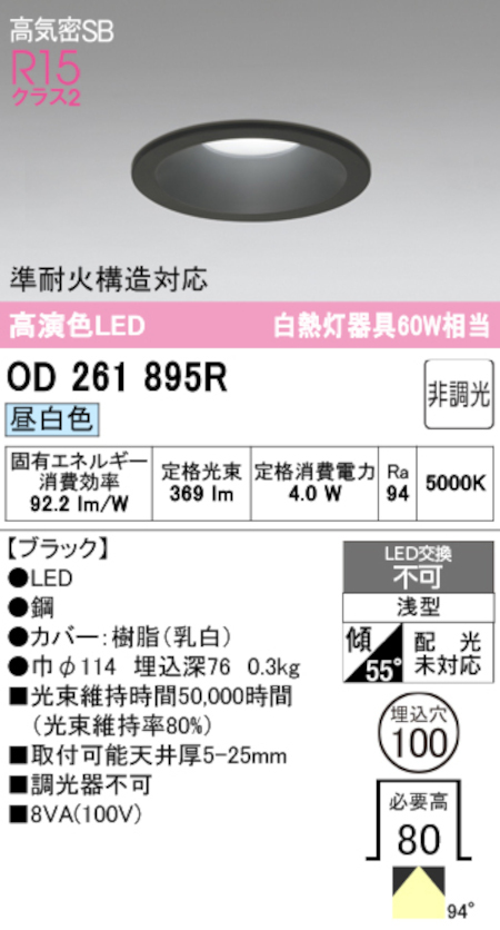 オーデリック OD261895R LED一体型ダウンライト Φ100 準耐火構造対応 非調光 白熱灯60W相当昼白色 369lm 色ブラック