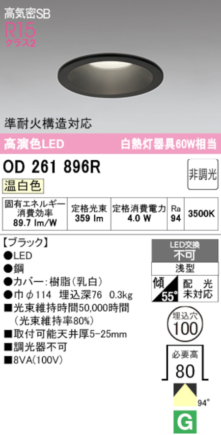 オーデリック OD261896R LED一体型ダウンライト Φ100 準耐火構造対応 非調光 白熱灯60W相当温白色 359lm 色ブラック