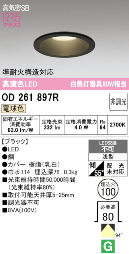 オーデリック OD261897R LED一体型ダウンライト Φ100 準耐火構造対応 非調光 白熱灯60W相当電球色 332lm 色ブラック