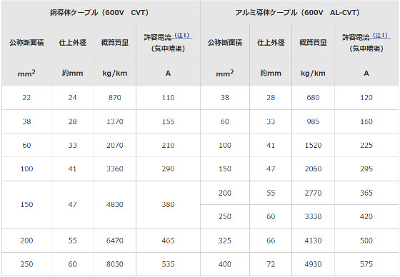 ・アルミ導体ケーブルは許容電流が銅よりも劣るため、銅導体ケーブルより導体サイズを1~2UPさせる必要があります。