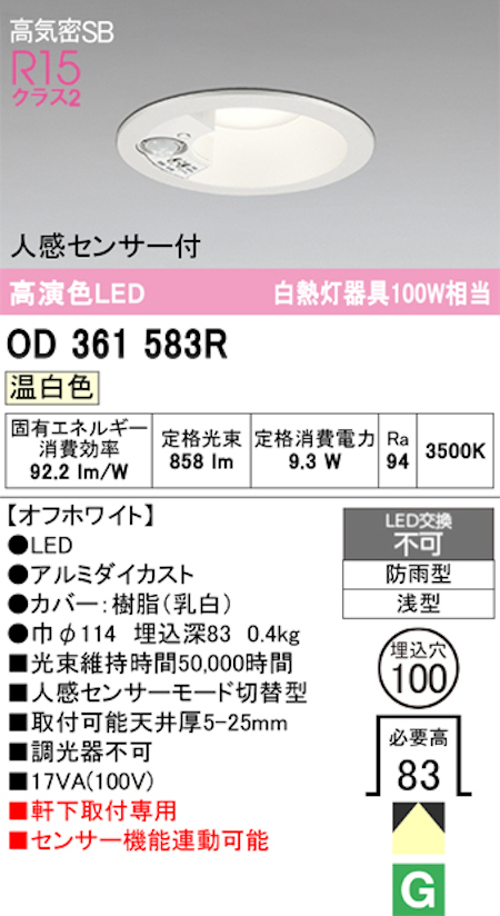 オーデリック OD361583R 軒下用LEDダウンライト防雨型 人感センサーモード切替型 白熱灯器具100W相当 温白色 オフホワイト