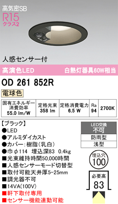 オーデリック OD261852R 軒下用LEDダウンライト防雨型 人感センサーモード切替型 白熱灯器具60W相当 電球色 ブラック