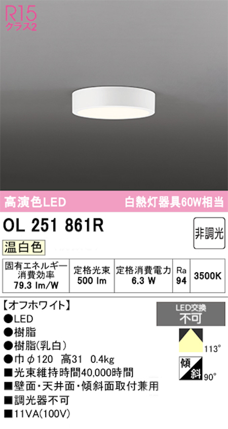 オーデリック OL251861R 小型LEDシーリングライト 非調光 白熱灯器具60W相当 温白色