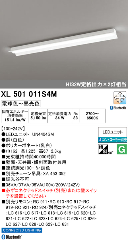 オーデリック XL501011S4M LEDユニット型ベースライト 40形 調光・調色タイプ 反射笠付 Hf32W定格出力×2灯相当 昼白色