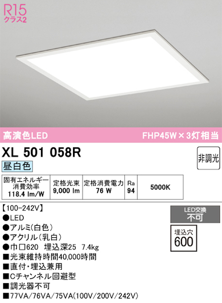 オーデリック XL501058R LEDスクエア型ベースライト 直付・埋込兼用型 FHP32Wx3灯相当 非調光タイプ 光束5000lm 昼白色