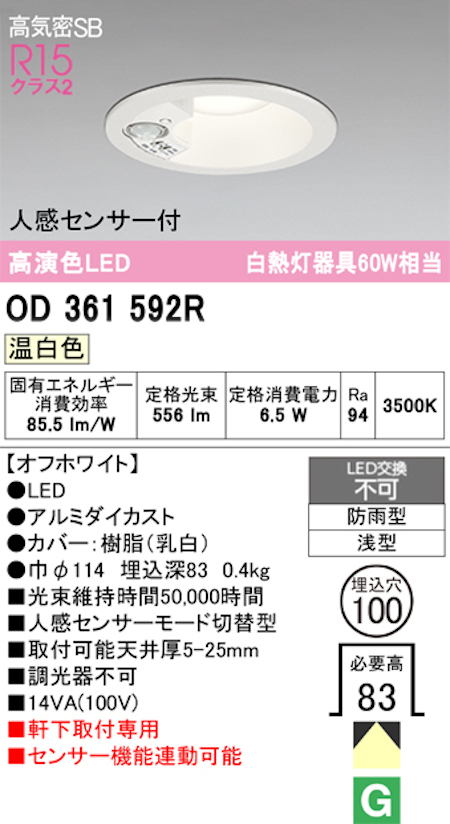 オーデリック OD361592R 軒下用LEDダウンライト防雨型 人感センサーモード切替型 白熱灯器具60W相当 温白色 オフホワイト