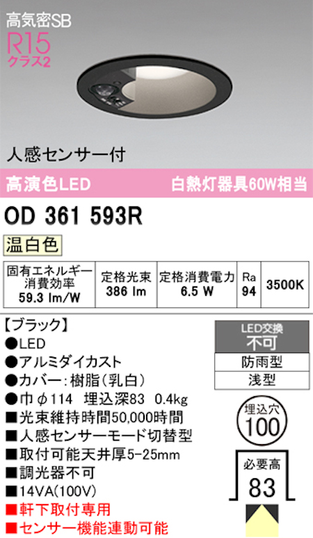 オーデリック OD361593R 軒下用LEDダウンライト防雨型 人感センサーモード切替型 白熱灯器具60W相当 温白色 ブラック