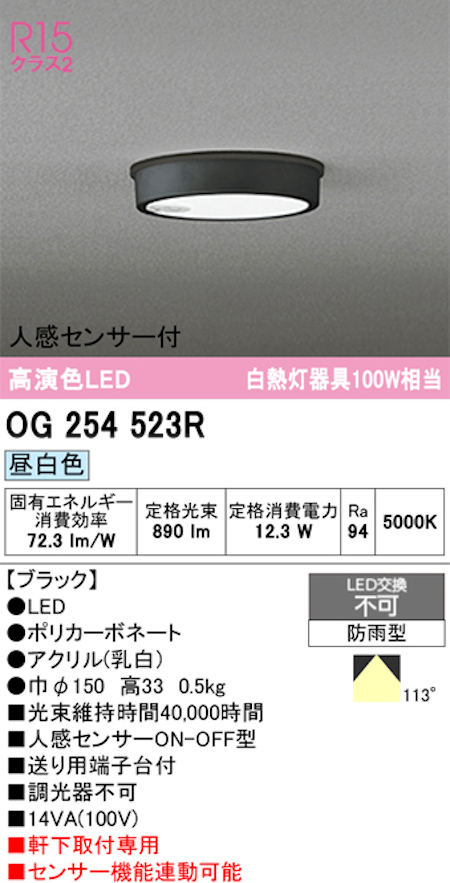 オーデリック OG254523R 軒下用シーリングライト 防雨型人感センサーON-OFF型 白熱灯100W相当 昼白色 ブラック