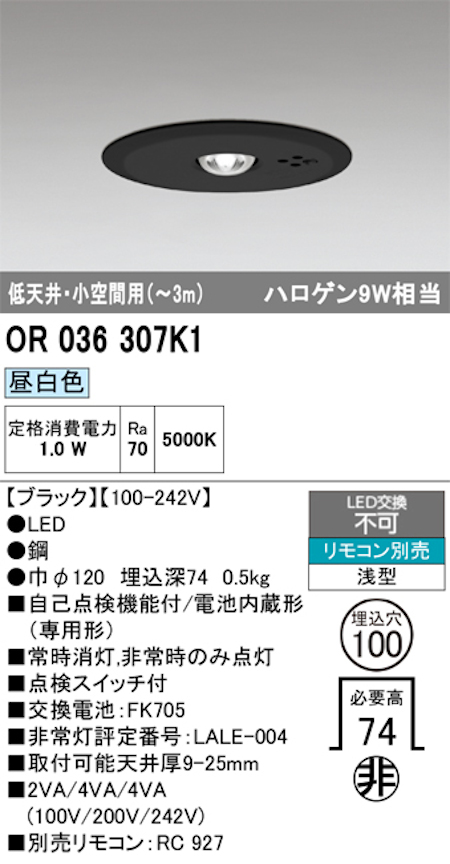 オーデリック OR036307K1 非常灯 埋込型 低天井・小空間~3m ハロゲン9W相当 昼白色 ブラック