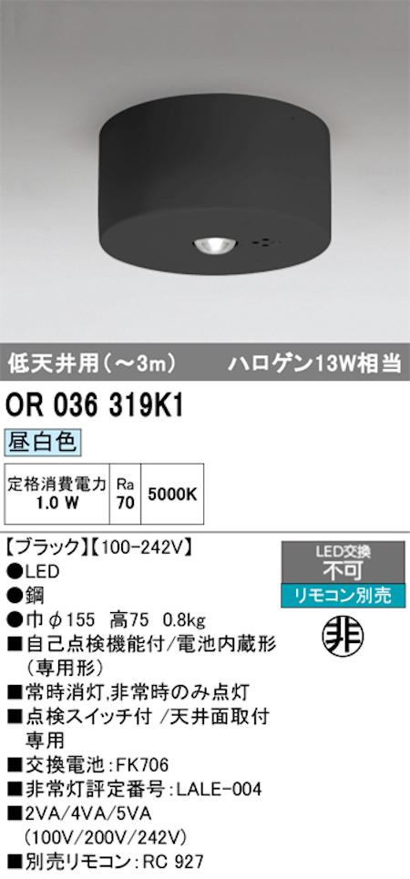 オーデリック OR036319K1 非常灯 直付型 低天井~3m ハロゲン13W相当 昼白色 ブラック