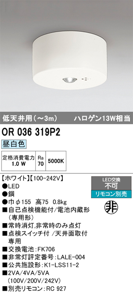 オーデリック OR036319P2 非常灯 直付型 低天井~3m ハロゲン13W相当 昼白色 ホワイト