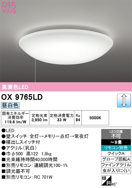 オーデリック OX9765LD ~6畳用LEDシーリングライト 引き紐スイッチ 調光タイプ 昼白色 ※リモコン別売