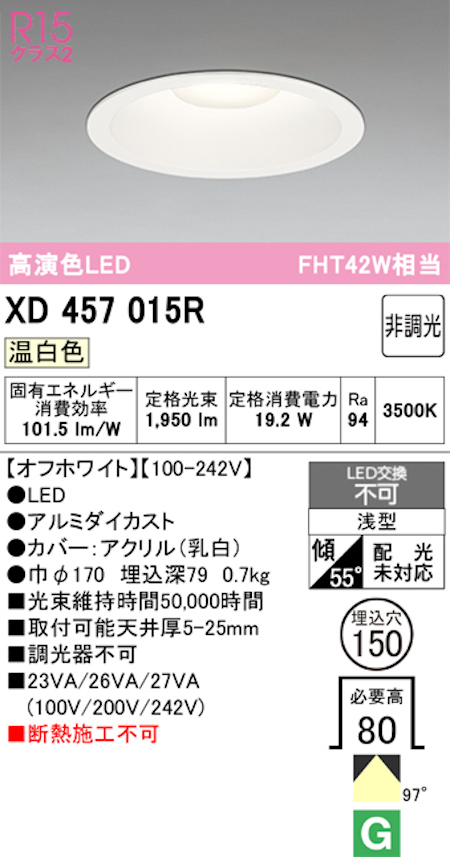 オーデリック XD457015R LED一体型ダウンライト Φ150 非調光 FHT42W相当 温白色 オフホワイト