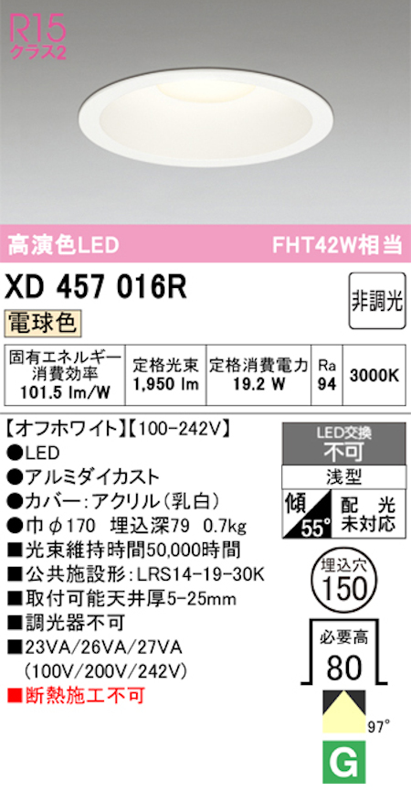 オーデリック XD457016R LED一体型ダウンライト Φ150 非調光 FHT42W相当 電球色 オフホワイト