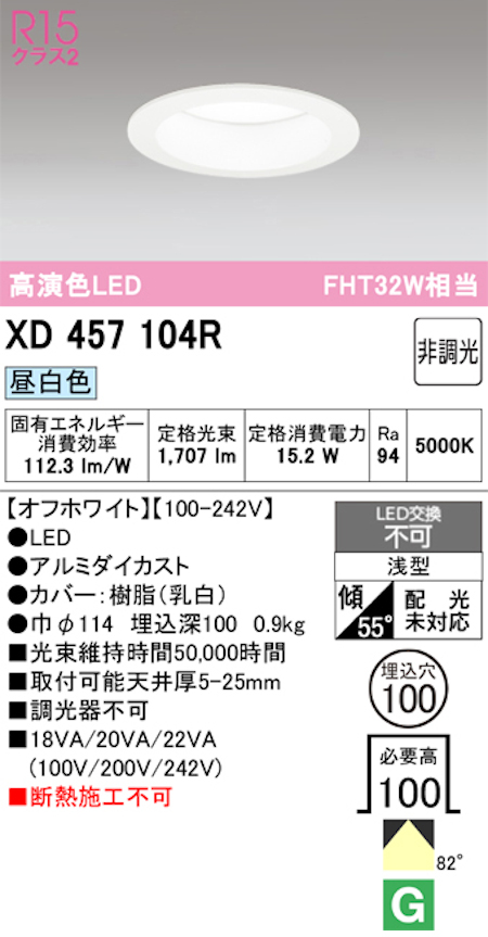 オーデリック XD457104R LED一体型ダウンライト Φ100 非調光 FHT32W相当 昼白色 オフホワイト