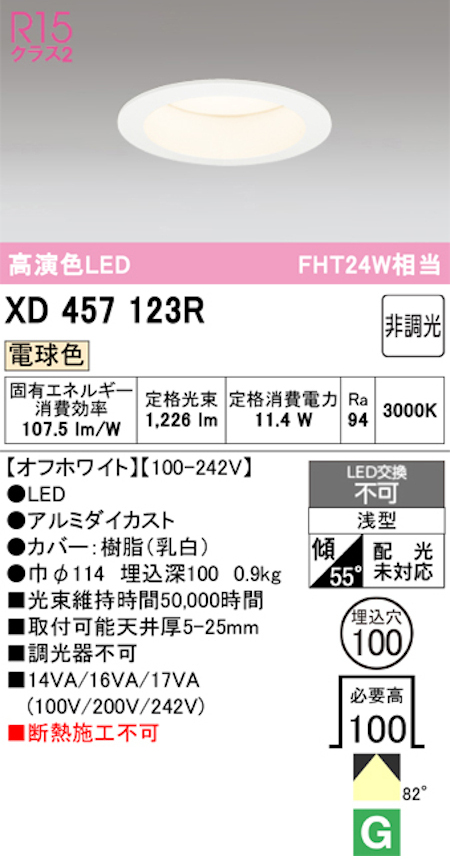 オーデリック XD457123R LED一体型ダウンライト Φ100 非調光 FHT24W相当 電球色 オフホワイト