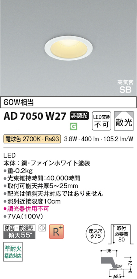 コイズミ照明 AD7050W27 S形白枠ダウンライト 75φ 準耐火構造対応 防雨・防湿型 60W相当 非調光 電球色