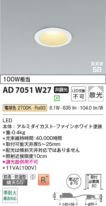 コイズミ照明 AD7051W27 S形白枠ダウンライト 75φ 準耐火構造対応 防雨・防湿型 100W相当 非調光 電球色