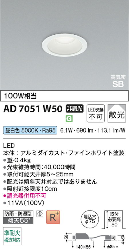 コイズミ照明 AD7051W50 S形白枠ダウンライト 75φ 準耐火構造対応 防雨・防湿型 100W相当 非調光 昼白色