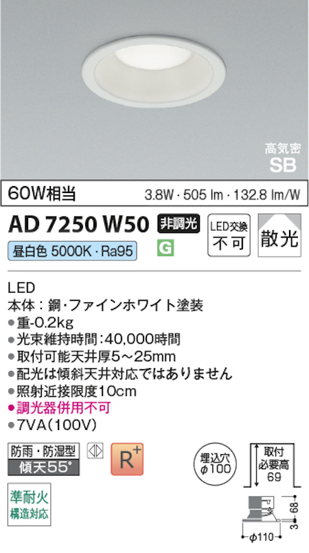 コイズミ照明 AD7250W50 S形白枠ダウンライト 100φ 準耐火構造対応 防雨・防湿型 60W相当 非調光 昼白色