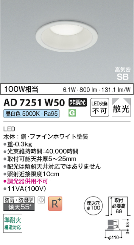 コイズミ照明 AD7251W50 S形白枠ダウンライト 100φ 準耐火構造対応 防雨・防湿型 100W相当 非調光 昼白色