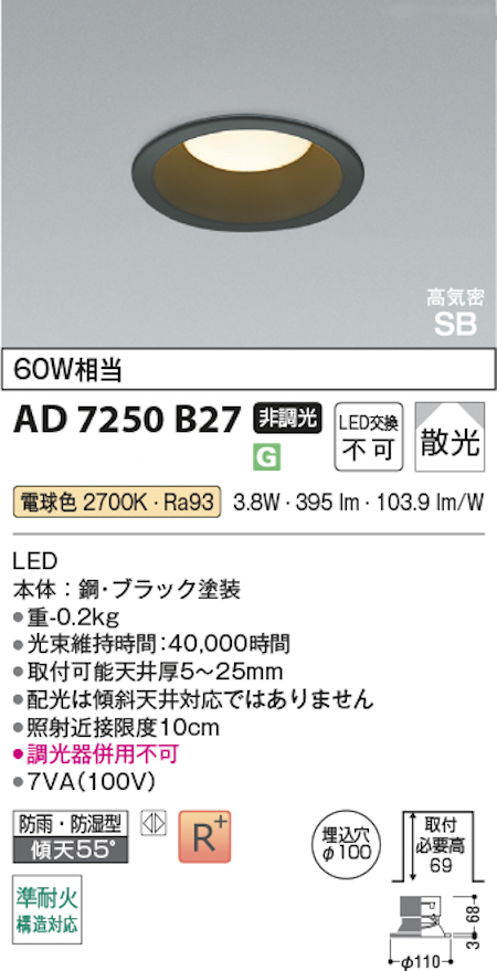 コイズミ照明 AD7250B27 S形黒枠ダウンライト 100φ 準耐火構造対応 防雨・防湿型 60W相当 非調光 電球色