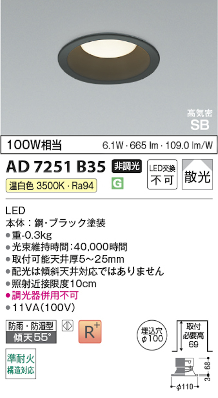 コイズミ照明 AD7251B35 S形黒枠ダウンライト 100φ 準耐火構造対応 防雨・防湿型 100W相当 非調光 電球色