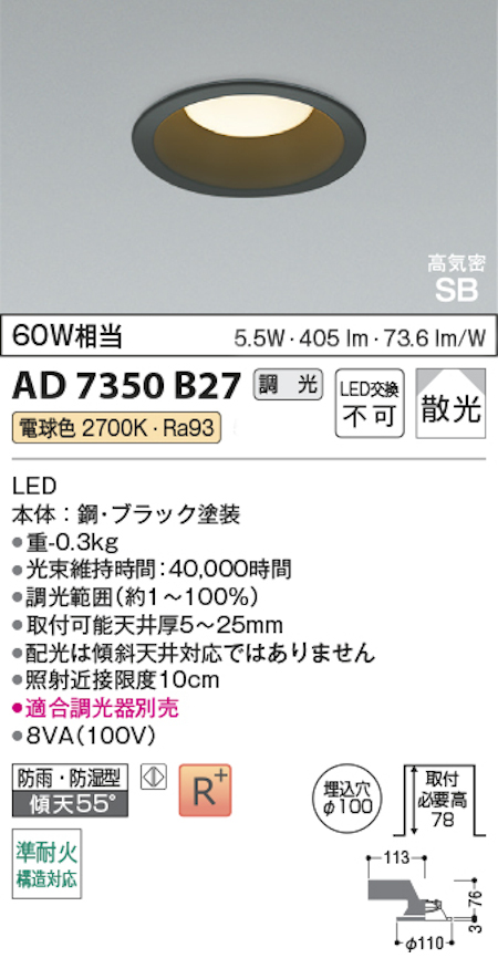 コイズミ照明 AD7350B27 S形黒枠ダウンライト 100φ 準耐火構造対応 防雨・防湿型 60W相当 調光 電球色