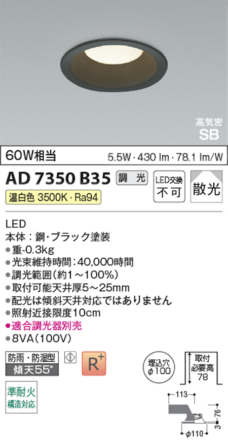 コイズミ照明 AD7350B35 S形黒枠ダウンライト 100φ 準耐火構造対応 防雨・防湿型 60W相当 調光 電球色