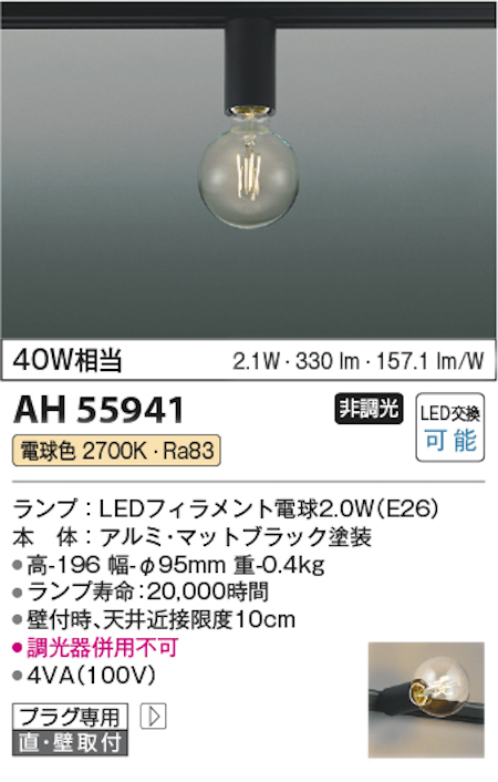 コイズミ照明 AH55941 プラグシーリング LEDフィラメント電球2.0W 40W相当 電球色 マッドブラック塗装