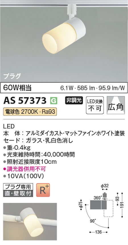 コイズミ照明 AS57373 スポットライト 広角 プラグタイプ 電球色 マットファインホワイト