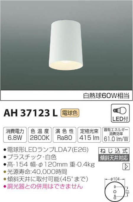 【数量限定】コイズミ照明 AH37123L LED小型シーリングライト 60W相当 電球色 白色(不透過)