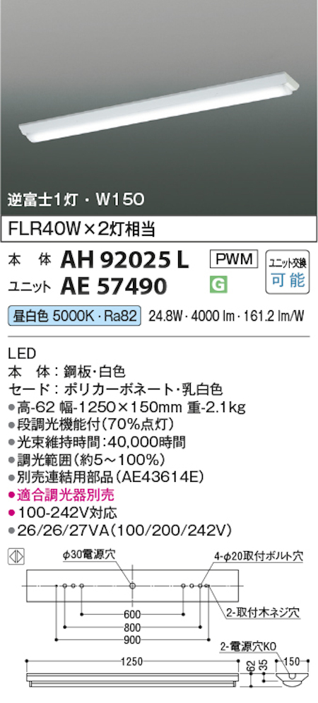 コイズミ照明 AH92025L+AE57490 LEDベースライト 本体+ユニット 40形逆富士型 FLR40W x 2灯相当 昼白色