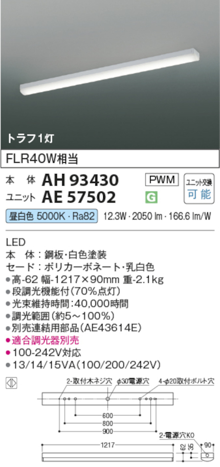 コイズミ照明 AH93430+AE57502 LEDベースライト 本体+ユニット 40形トラフ型 FLR40W x 1灯相当 昼白色