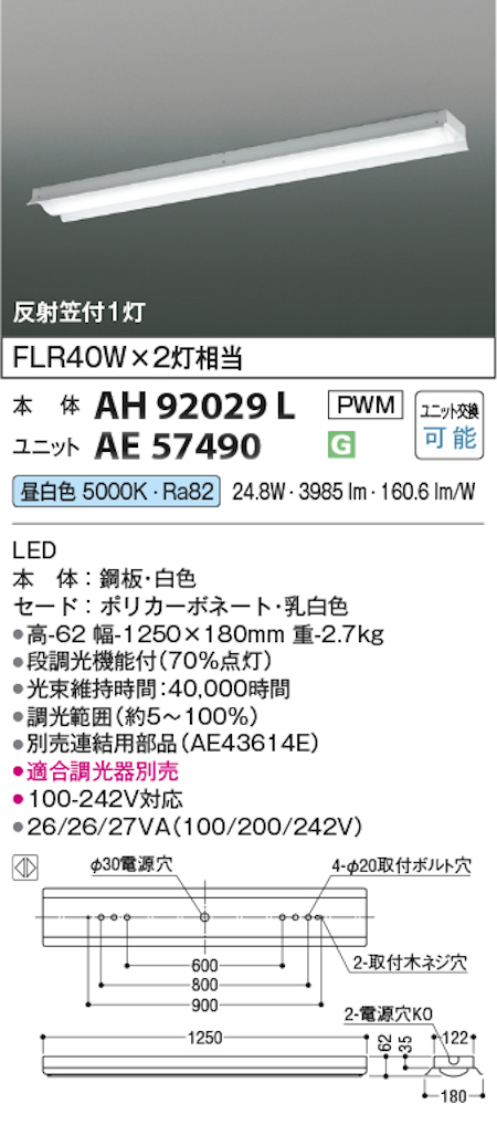 コイズミ照明 AH92029L+AE57490 LEDベースライト 本体+ユニット 40形反射笠型 FLR40W x 2灯相当 昼白色