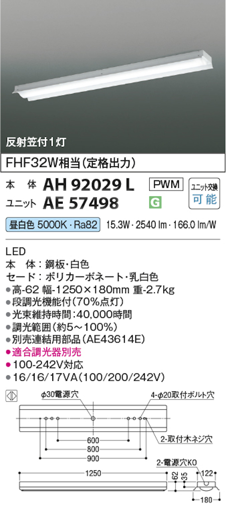 コイズミ照明 AH92029L+AE57498 LEDベースライト 本体+ユニット 40形反射笠型 FHF32W x 1灯相当 定格出力 昼白色