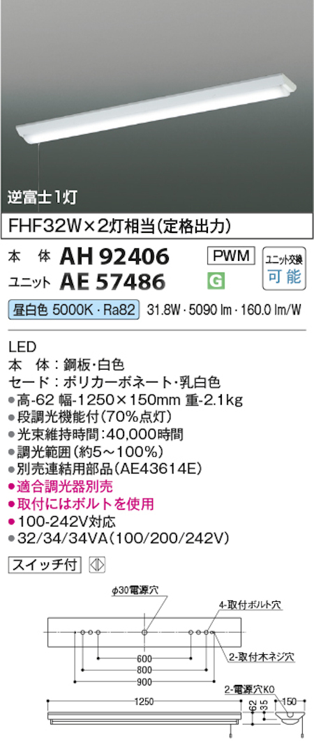 コイズミ照明 AH92406+AE57486 LEDベースライト 本体+ユニット 40形逆富士型 FHF32W x 2灯相当 定格出力 プルスイッチ付 昼白色