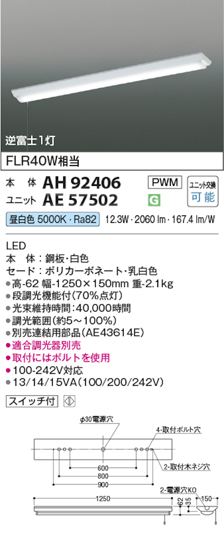 コイズミ照明 AH92406+AE57502 LEDベースライト 本体+ユニット 40形逆富士型 FLR40W x 1灯相当 プルスイッチ付 昼白色