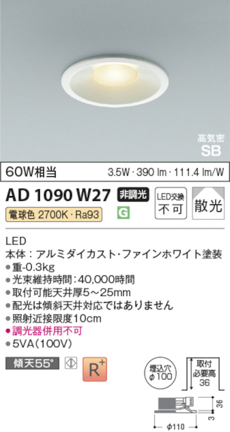 コイズミ照明 AD1090W27 S形浅型ダウンライト 100φ 非調光 60W相当 電球色