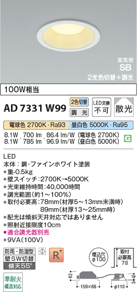 コイズミ照明 AD7331W99 S形2光色切替ダウンライト 100φ 準耐火構造対応 調光 100W相当 電球色2700k→昼白色5000k