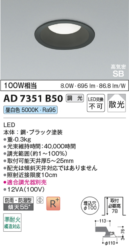 コイズミ照明 AD7351B50 S形黒枠ダウンライト 100φ 準耐火構造対応 防雨・防湿型 100W相当 調光 電球色