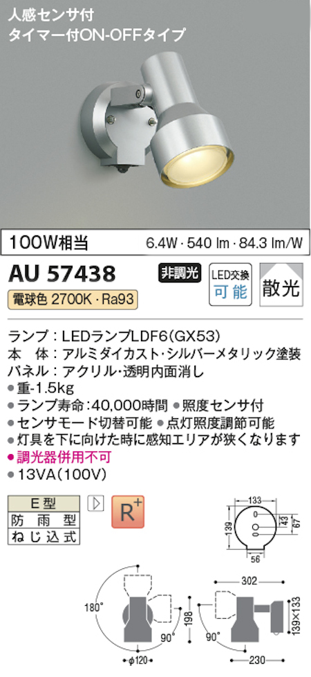 コイズミ照明 AU57438 防雨型スポットライト 人感センサ付 100W相当 電球色 色 シルバーメタリック