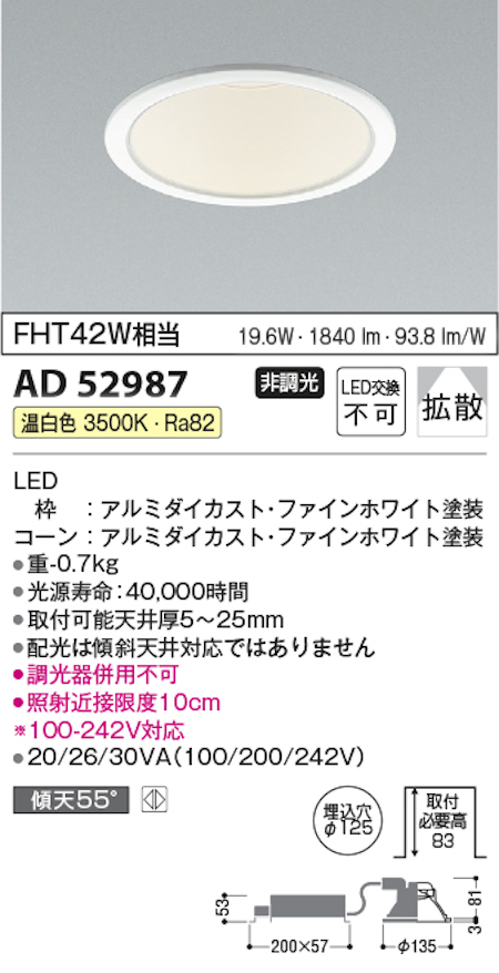 コイズミ照明 AD52987 M型コンフォートベースダウンライト  非調光 埋込穴Φ125 FHT42W相当 温白色