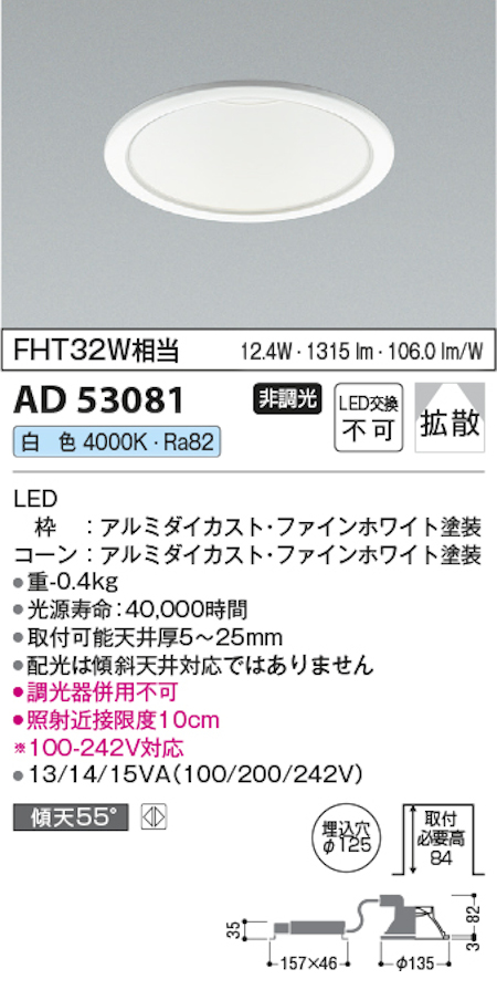 コイズミ照明 AD53081 M型コンフォートベースダウンライト 非調光 埋込穴Φ125 FHT32W相当 白色
