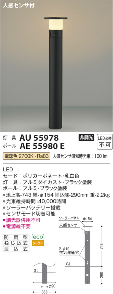 コイズミ照明 AU55978+AE55980E ソーラーパネル搭載ガーデンライト 700mmタイプ 色ブラック