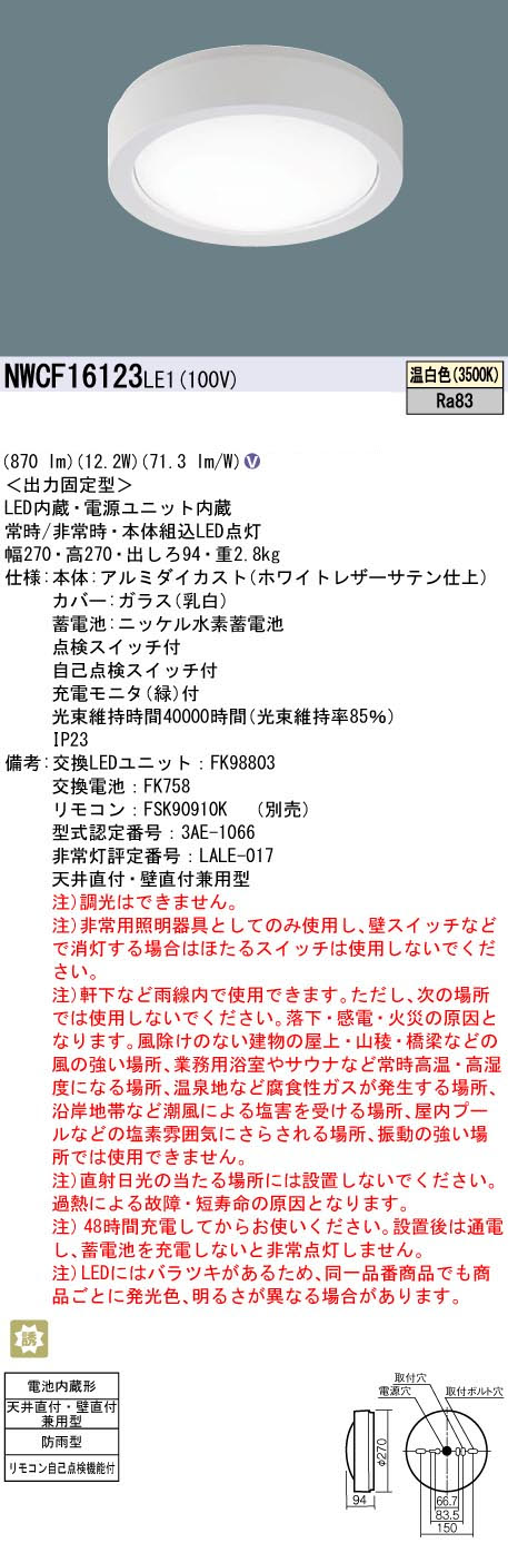 パナソニック NWCF16123LE1 防雨型シーリング階段灯 壁・天井直付型 ベーシック ホワイト高光束タイプ 870lm 温白色