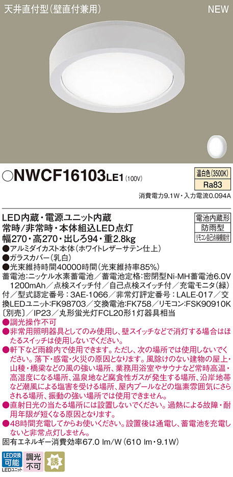 パナソニック NWCF16103LE1 防雨型シーリング階段灯 壁・天井直付型 ベーシック ホワイト低光束タイプ 610lm 温白色